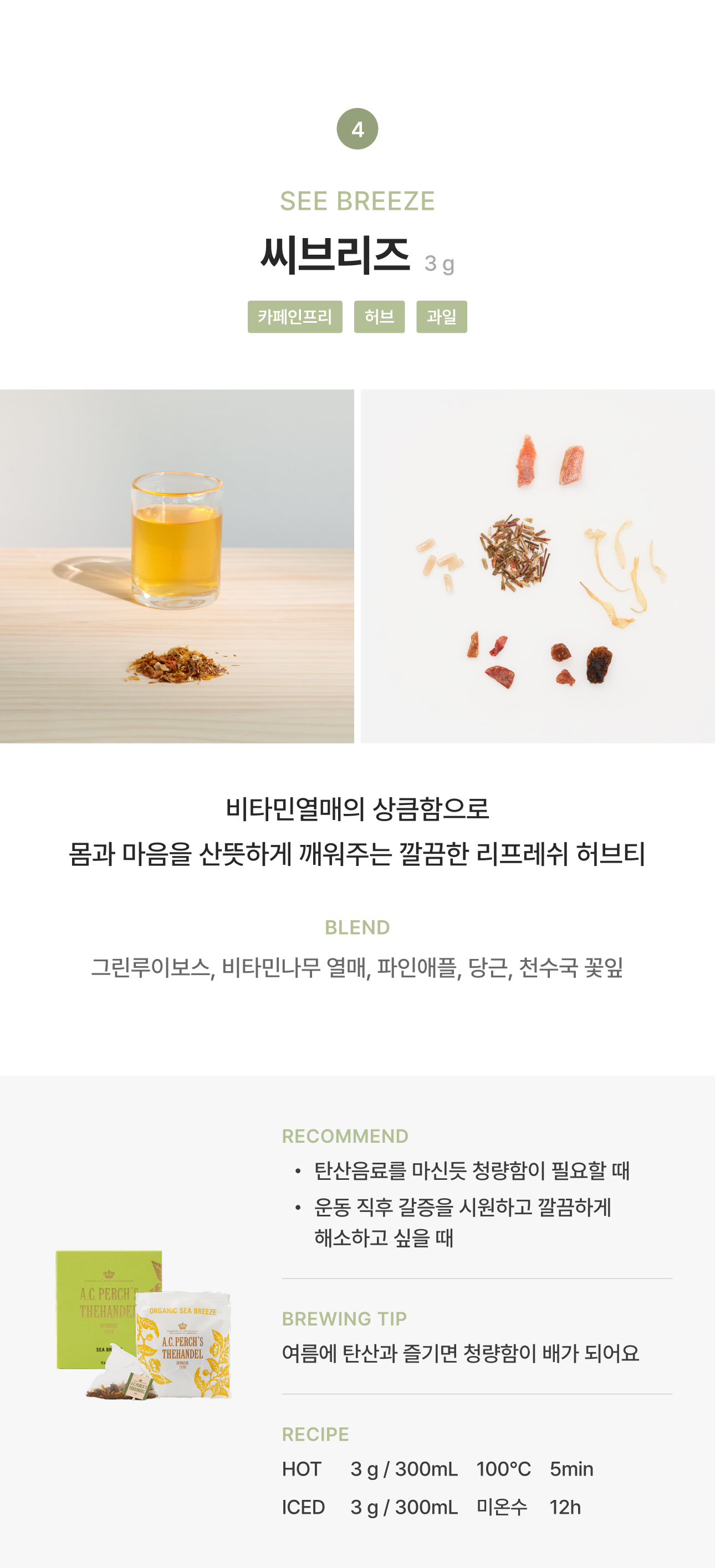 5. 씨브리즈 : 유기농그린루이보스 71.25%(남아프리카공화국), 유기농사과박 10.75%, 유기농파인애플조각(파인애플, 쌀가루) 5%, 유기농비타민나무열매 5%, 유기농당근, 구연산(산도조절제), 유기농 금잔화꽃, 천연향료