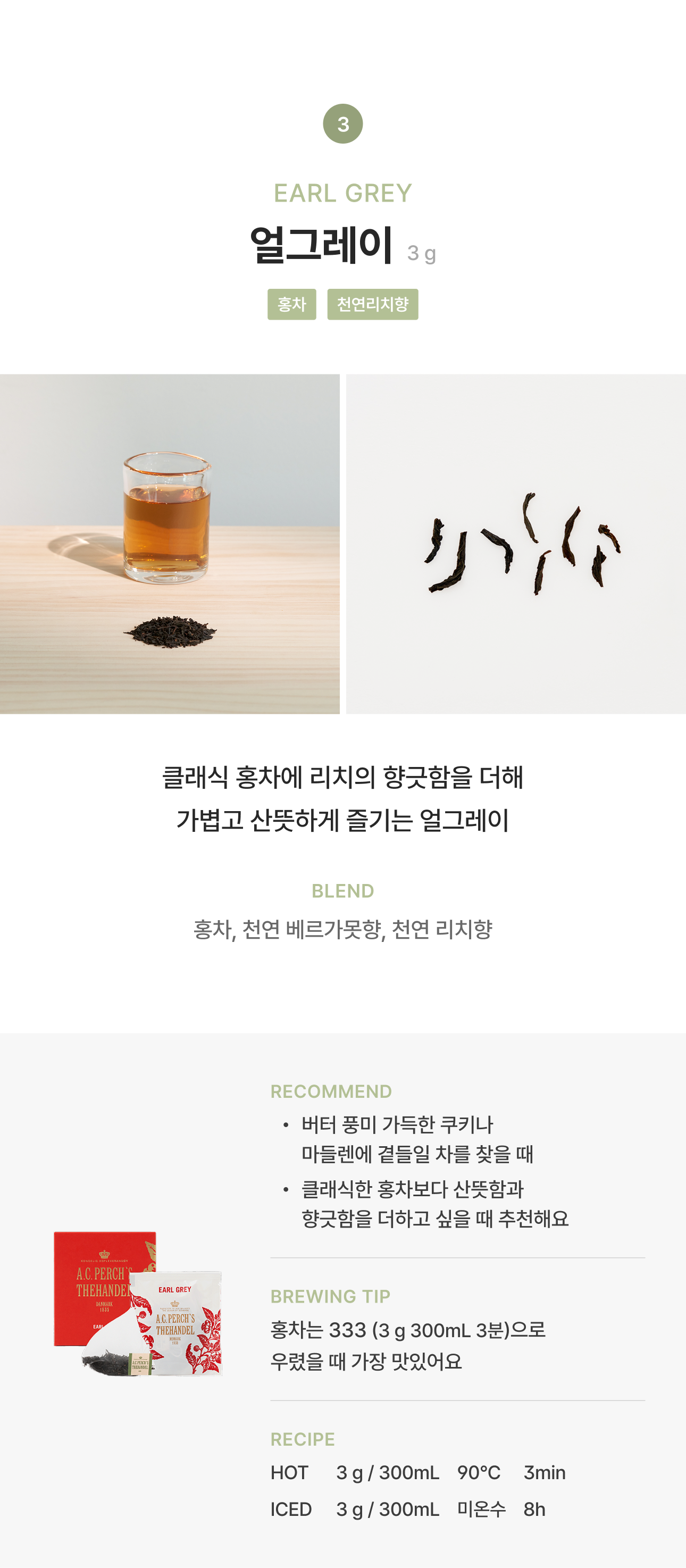 3. 얼그레이 : 홍차 98.7% (중국), 천연향료 1.3% (베르가못향, 리치향)